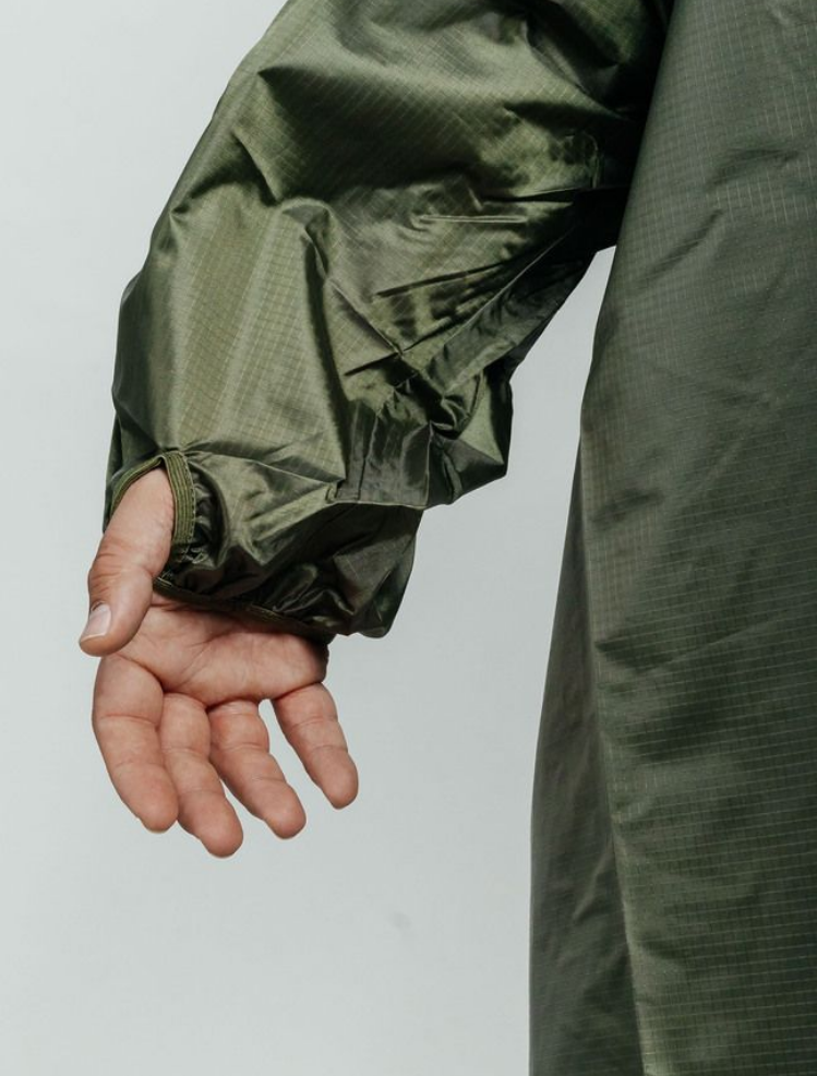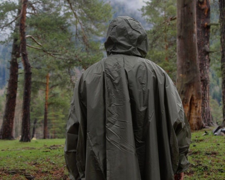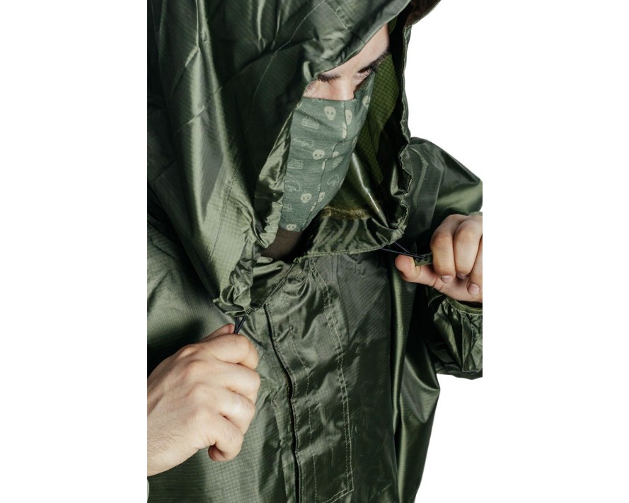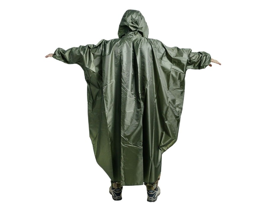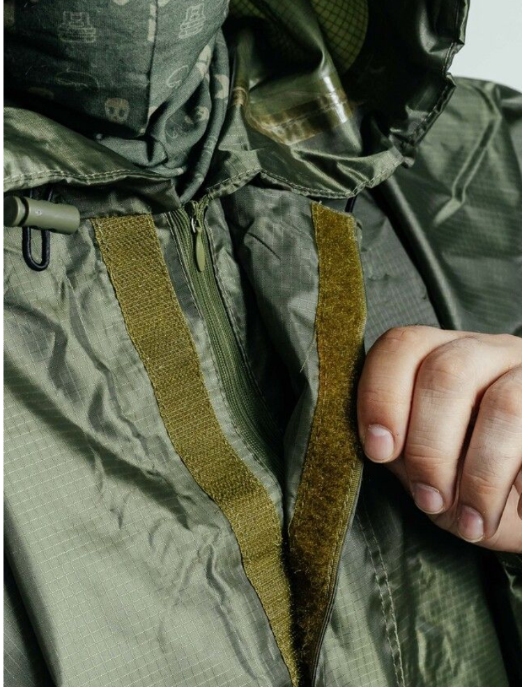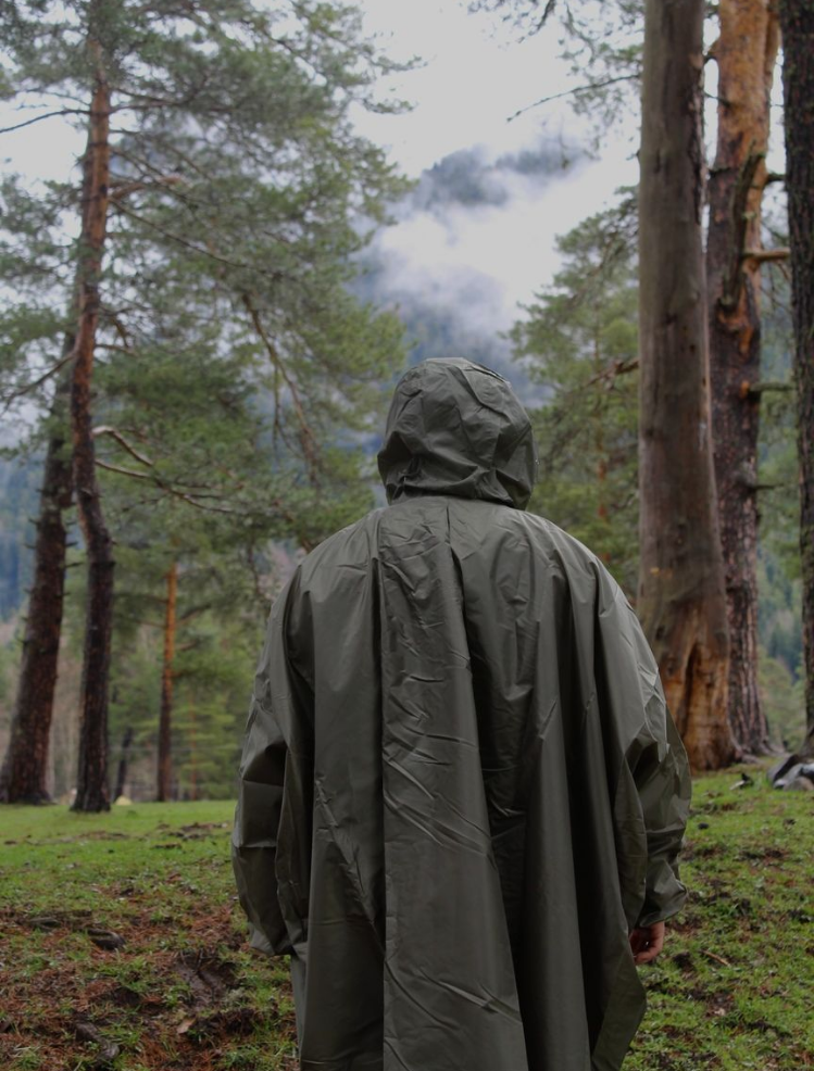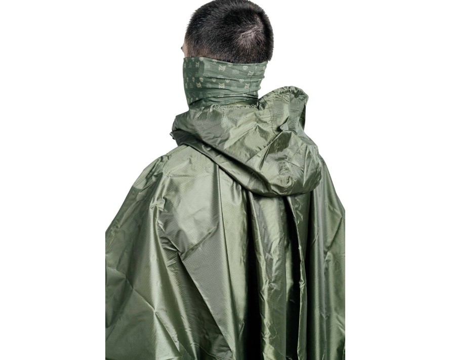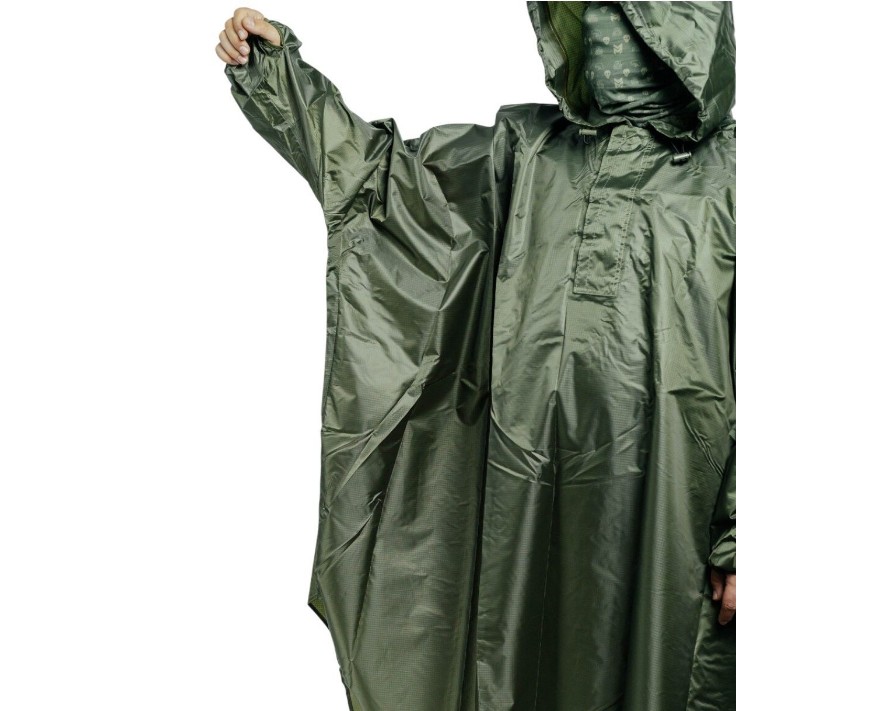 Пончо выполнено из армированного водостойкого материала, защищая пользователя от дождя и ветра