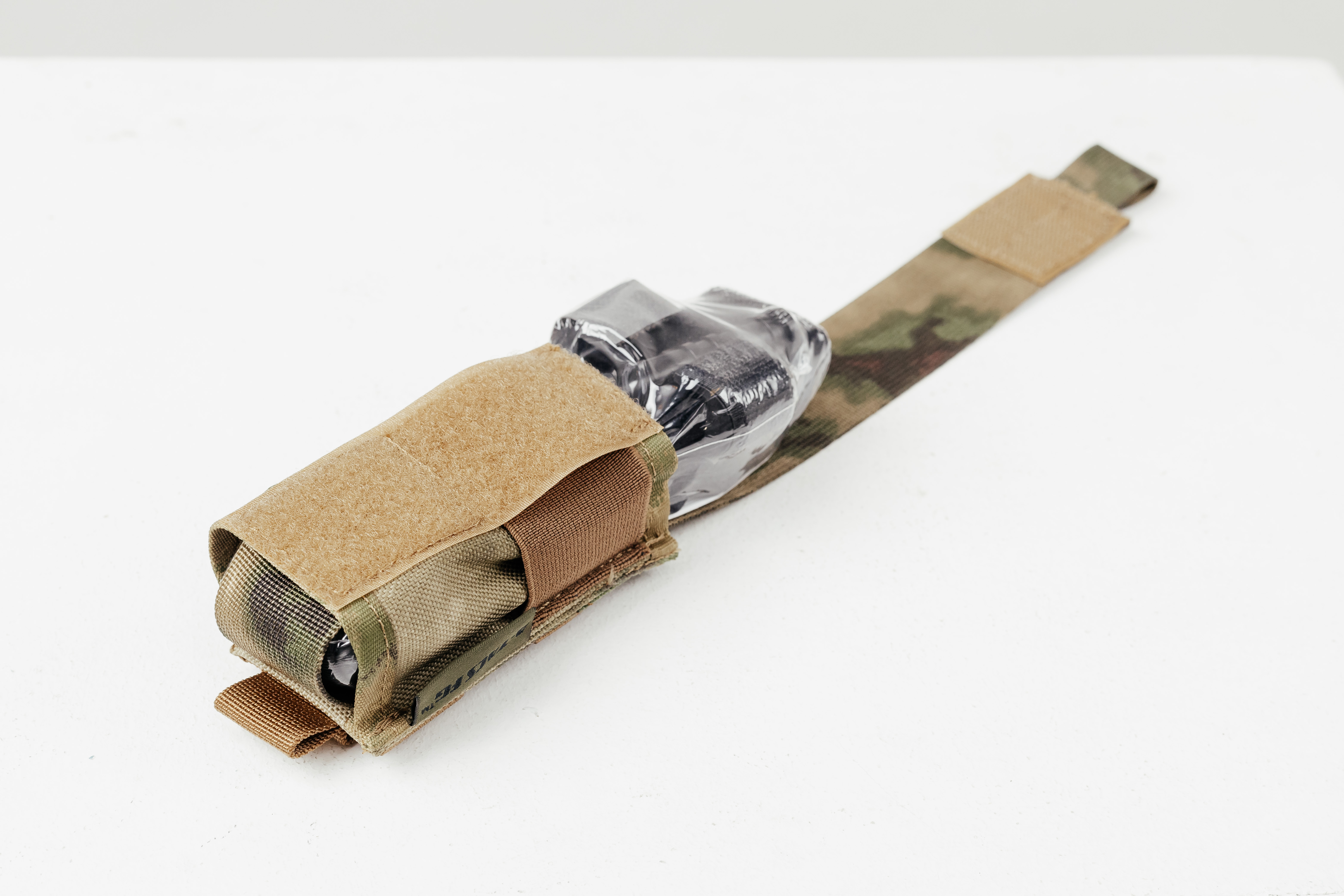 Широкая эластичная стропа опоясывает подсумок снаружи, надежно фиксируя турникет в готовом положении