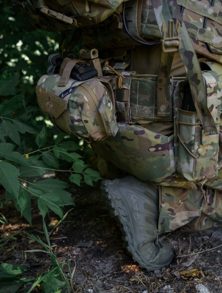 В нижней части рукава расположены эластичные шнуры и стропа для изменения объема подсумка, его комфортного переоснащения или
