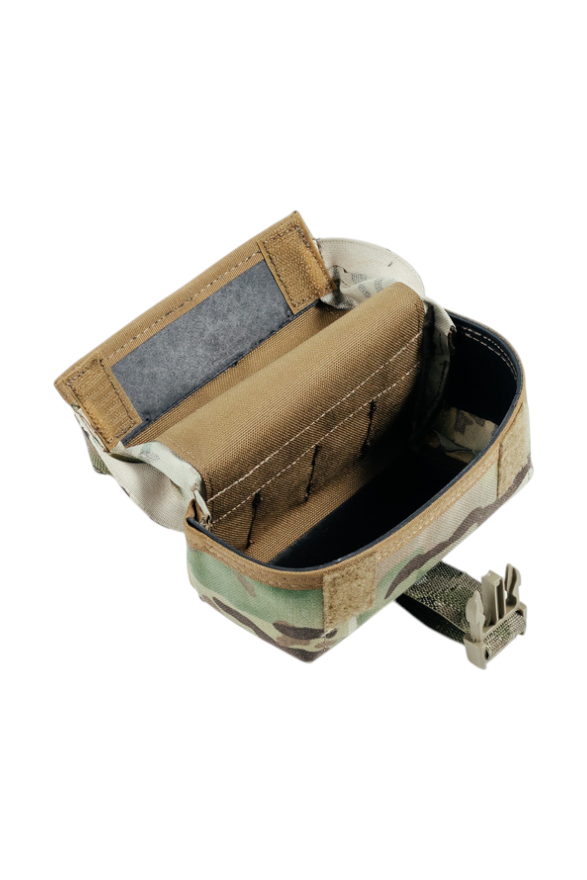 В походном положении подсумок фиксируется с помощью прочного фастекса, а в оперативном положении — с помощью липучки на внутренней стороне крышки